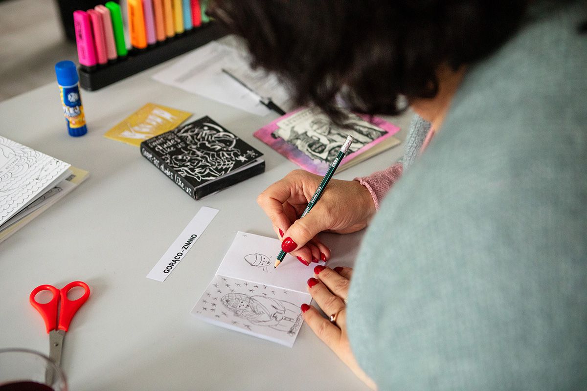 Zin jest publikacją niezależną, często stworzoną na kartce papieru i złożoną w małą książeczkę. Warsztat ma za zadanie przybliżyć uczestnikom, czym są ziny oraz zachęcić do opowiedzenia historii na swój temat. Opracujemy swoją publikację na bazie przeciwieństw, które wylosujemy. Każda osoba dostanie swoje dwa słowa, które są sobie przeciwstawne i zinterpretuje temat na swój sposób. Zastanowimy się, jak podejść do tematu i pomyślimy nad narracją w naszej publikacji.
